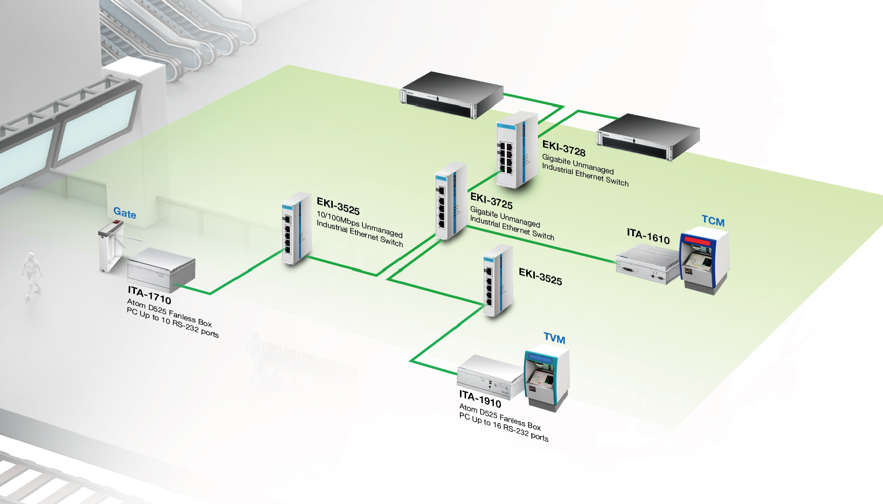 ▌▌圖表 下面的系統(tǒng)類型說明了自動票價(jià)收集系統(tǒng)的運(yùn)行方式。ITA-1710嵌入了TVM和AGM作為控制器,并且可以通過工業(yè)以太網(wǎng)EKI訪問并傳輸數(shù)據(jù)到后端控制中心。